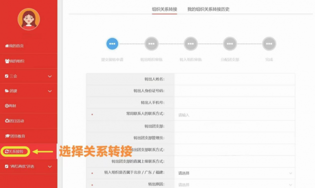 登录后点击界面左侧“关系转接”,点击“组织关系转接”选项,完整并且正确地填写页面的相关信息后点击“申请转入组织”(“转入组织”为新生所在学院团委)确定个人信息无误后点击提交,等待团组织关系转接审批即可。