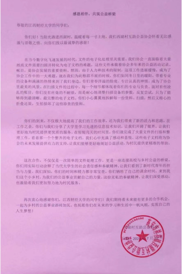面对西湖村公益协会纸质文档整理的难题,统计学院“统统青年心向党实践队”携带设备耐心扫描归档,为零散资料装上“数字引擎”。协会来信感谢同学们为公益工作带来的高效与规范,称赞此举“搭建了高校与乡村公益的桥梁”。