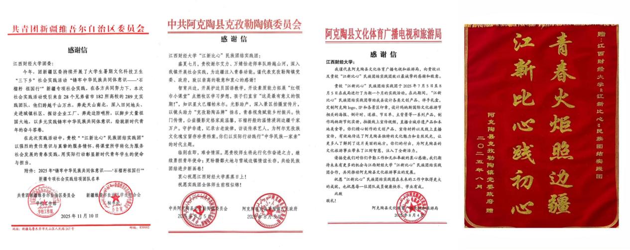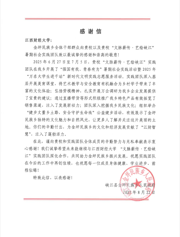 这一封封感谢信,是对江财学子躬身实践、服务社会的最好褒奖,也是激励他们继续前行的温暖动力。校团委将持续以“三下乡”等活动为重要平台,引导青年在广阔的基层天地中锤炼本领、增长才干,用奋斗书写无愧于时代的青春篇章。(文/校团委阿依江·叶尔肯太 黄陈涵 袁倪 徐俪珊 吴燕 郭馨然 值编/李欣颖 责编/郭馨然 郑宛芊 饶震 审核/王昊 阳铃 李良鹏)