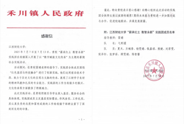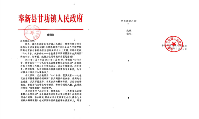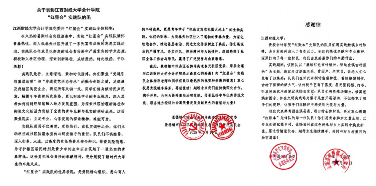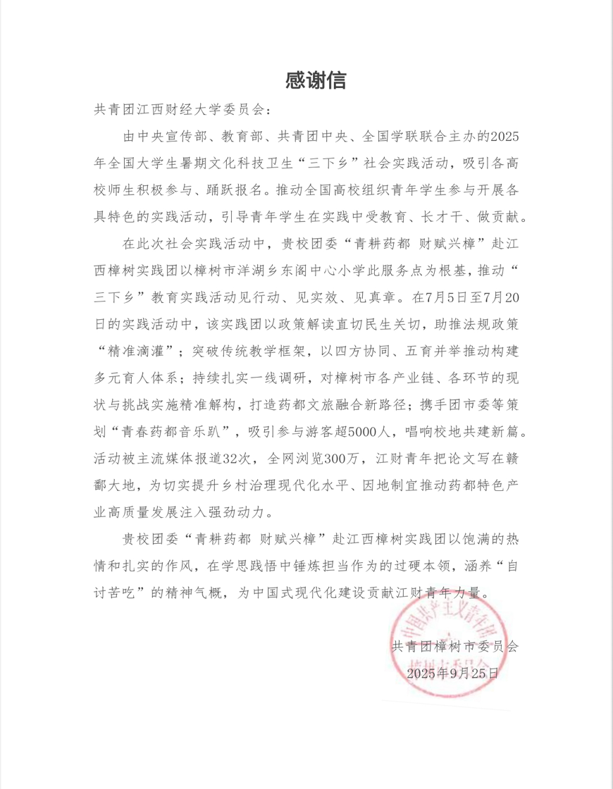 2025年暑期,我校青年学子怀抱赤子之心与青春理想,以文化浸润乡土、以科技赋能发展、以服务温暖民心,深入基层一线,足迹遍布田间地头、城镇社区。近日,一封封来自全国多地基层单位的感谢信如雪片般飞来,真挚的话语中满载对江财学子服务成效的高度肯定。这些信件不仅见证了“三下乡”活动的扎实成果,更彰显了新时代江财青年扎根大地、与时代同行的责任与担当。
