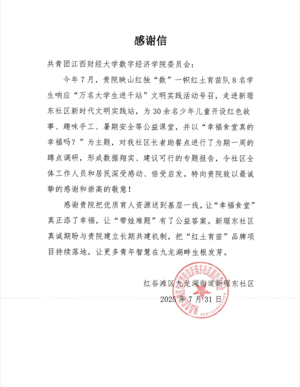 在南昌新琚东社区,数字经济学院“红土育苗队”进驻新时代文明实践站,开设公益课堂缓解“带娃难”,围绕社区“幸福食堂”开展调研,形成报告助力服务优化。社区来信表达感谢,并期待与学院建立长期共建机制,让“红土育苗”项目持续赋能社区治理。