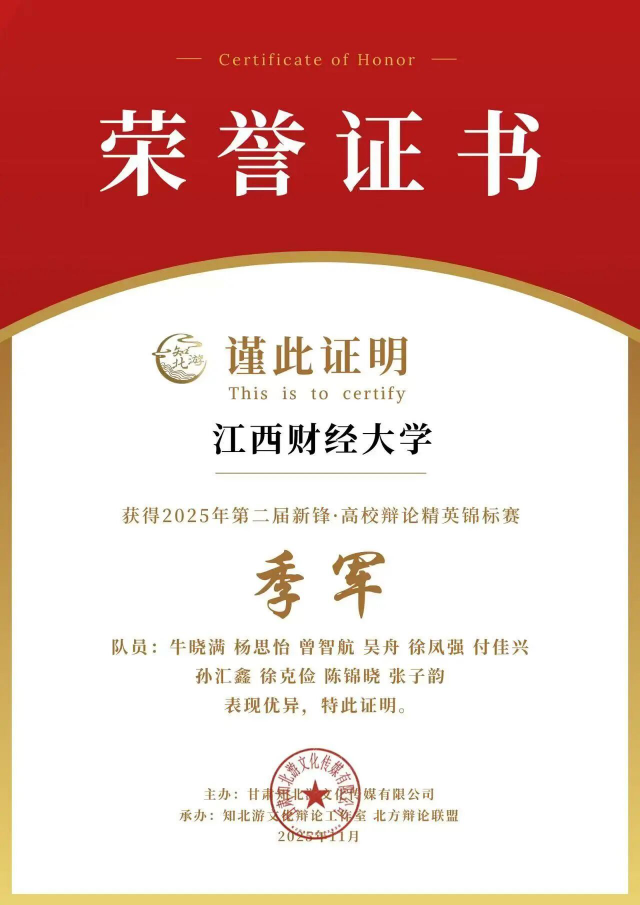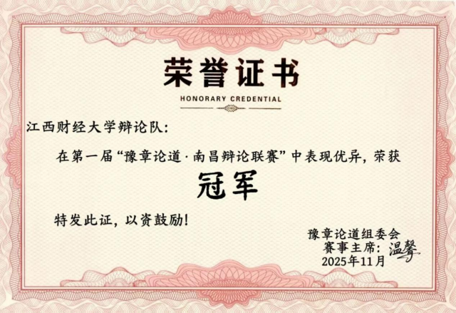 “往昔已展千重锦,明朝更进百尺竿”。江财辩论队以青春之名,执思辨之笔,在时代的舞台上写下属于江财人的智慧篇章。未来,江财辩论人将继续怀揣热爱,步履不停,在更广阔的舞台上发出江西青年的声音。我们坚信,思辨的火种已在心中点燃,它将照亮前路,也必将燃动未来。江财辩论人,始终在路上,努力让世界听到江西的思辨之声。(文/王艺涵 李欣颖 值班编辑/罗嘉乐 责任编辑/郑宛芊 韩紫琳 饶震 审核/王昊 阳铃 李良鹏)