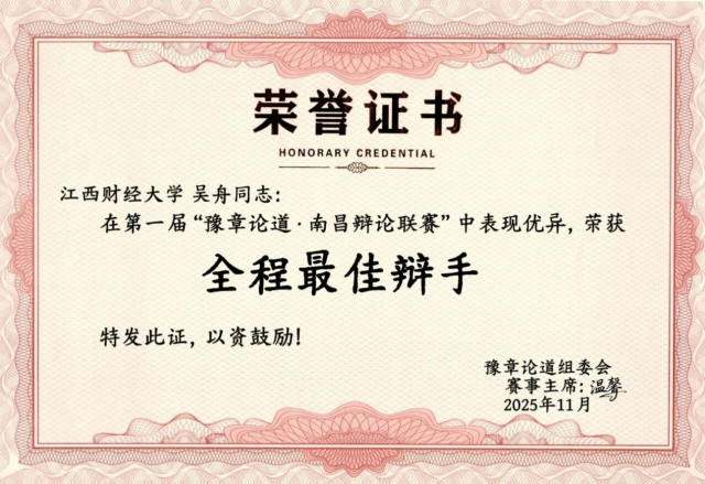 在刚刚落幕的华语辩论世界杯南昌赛区比赛中,我校辩论队凭借周密的赛前部署、敏捷的临场反应和团队成员间的默契配合,一路过关斩将、势如破竹,从众多高校中脱颖而出,勇夺桂冠!这支由吴舟、张子韵、温馨、曹恩楠、李雨晴、雷依琳、张秀楠、廖文欣、杨思怡、胡佳俪、徐凤强、王照民等同学组成,涵盖研究生与本科生,足以展现我校对辩论人才的培养。赛场之上,他们立论清晰、攻防有序,以逻辑为刃,以语言为盾,赢得评委与观众的一致赞誉。其中,2025级法律(法学)硕士吴舟凭借缜密的逻辑思维、精准的语言表达与沉稳的辩风,荣获“全程最佳辩手”荣誉称号。